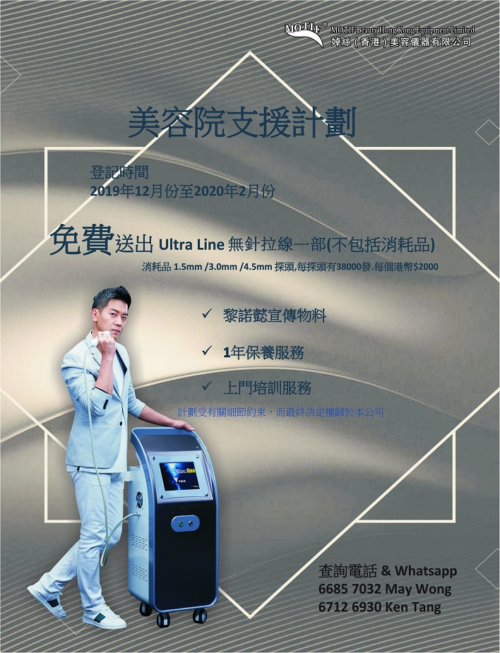 各位美容院經營者,您打算為美容院添置新儀器,卻苦無頭緒?抑或想開拓業務無奈資金有限?MOTIF婥絲(香港)美容儀器有限公司為業界推出筍爆全行的「美容院支援計劃」──免費送出Ultra Line無針拉線一部(不包括消耗品-1.5mm/3.0mm/4.5mm探頭,每個探頭能輸出30000發),同時提供三項服務:1)黎諾懿宣傳物料 2)1年保養服務 3)上門培訓服。計劃可一不可再,立即行動吧!登記日期:2019年12月-2020年2月。